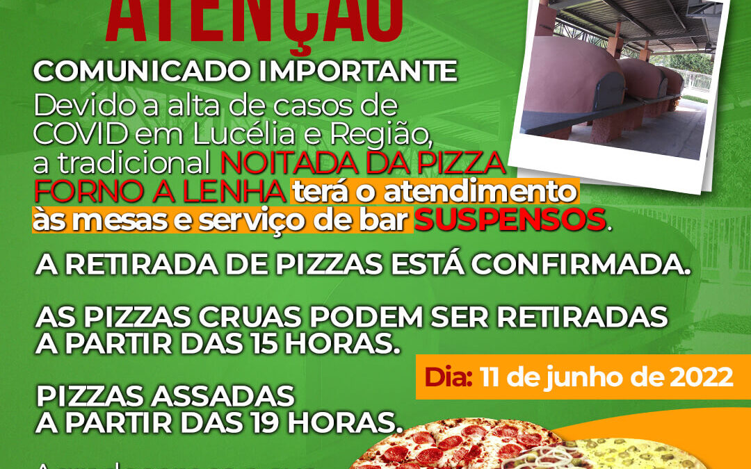 Informamos que DEVIDO A ALTA DE CASO DE COVID EM LUCÉLIA E REGIÃO a nossa tradicional NOITADA DA PIZZA, terá atendimentos as mesas e serviços de bar SUSPENSOS.